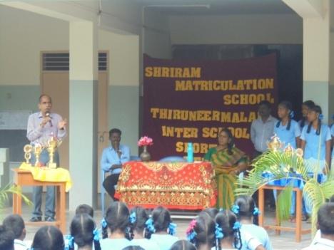 Shriram Matriculation School, Thiruneermalai , for the first time since its inception, organized an interschool Sports Tournament to promote physical activity and games in the neighbourhood. The tournament was organized in two games – volleyball for boys and throwball for girls. Twelve schools from nearby areas like Tambaram, Chromepet, Mudichur, Chitlapakkam participated.
